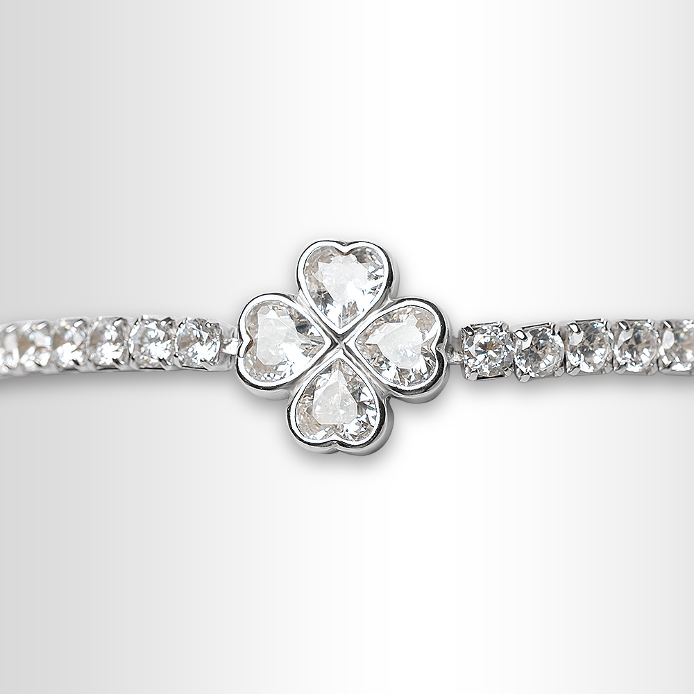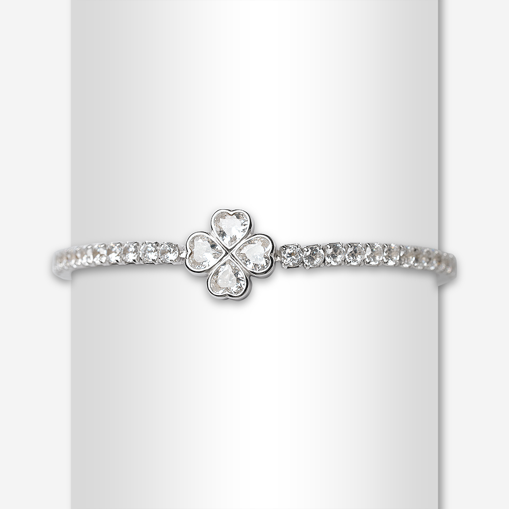 This bracelet is expertly crafted from premium 925 sterling silver and finished with a high-polish shine, giving it a radiant and sophisticated appearance. The central element features a delicately shaped four-leaf clover, each petal set with heart-shaped CZ stones for a touch of symbolism and sparkle. The band itself is paved with dainty CZ accents that catch the light from every angle. With its minimalist yet captivating design, the bracelet is lightweight and comfortable for all-day wear. The adjustable fit ensures a secure yet flexible hold on various wrist sizes. Plated with a rhodium coating, it resists tarnishing and maintains its brilliance for years. Every detail is thoughtfully designed to offer a luxurious yet effortless piece you can wear every day. Ideal for both casual and formal occasions, this bracelet is as versatile as it is elegant. It comes packaged in a premium gift box, making it perfect for gifting or treasuring as your own timeless accessory.