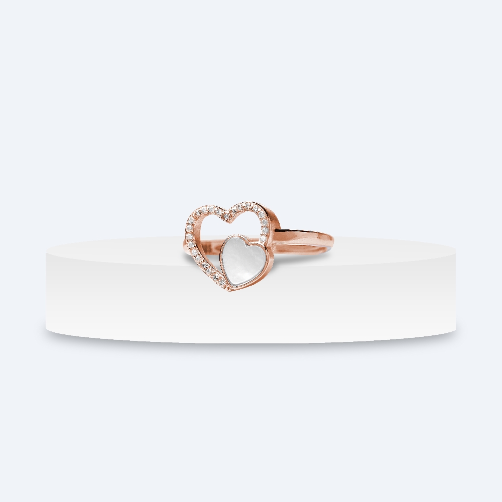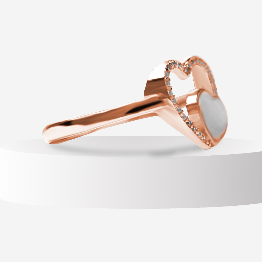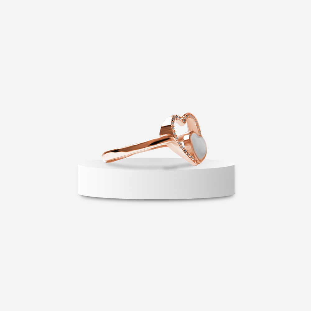 Celebrate the bond of love with the Heart Intertwine Mother of Pearl Ring from The Silver Soul. Crafted in high-polish rose gold finish, this elegant ring features two beautifully linked hearts — one adorned with shimmering CZ stones and the other filled with natural Mother of Pearl. Its modern yet timeless design makes it a perfect gift of affection or self-love.
