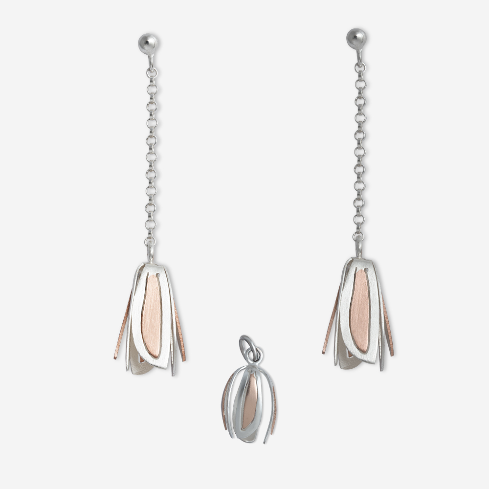 Inspired by the natural elegance of a blooming flower, the Petal Grace Set features a unique layered design with a harmonious blend of rose gold and silver finishes. The pendant and matching drop earrings are shaped like delicate petals that cascade gracefully, creating movement and dimension. With its soft dual-tone hues and artistic form, this set is perfect for women who appreciate modern, minimal yet statement-making jewelry. Whether it’s a brunch date or an evening out, this ensemble adds an air of effortless sophistication. A versatile gift choice for all seasons. The is no chain for this set.
