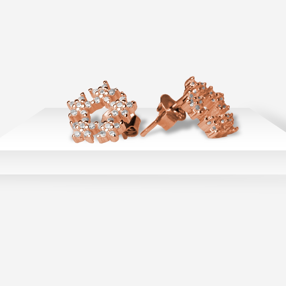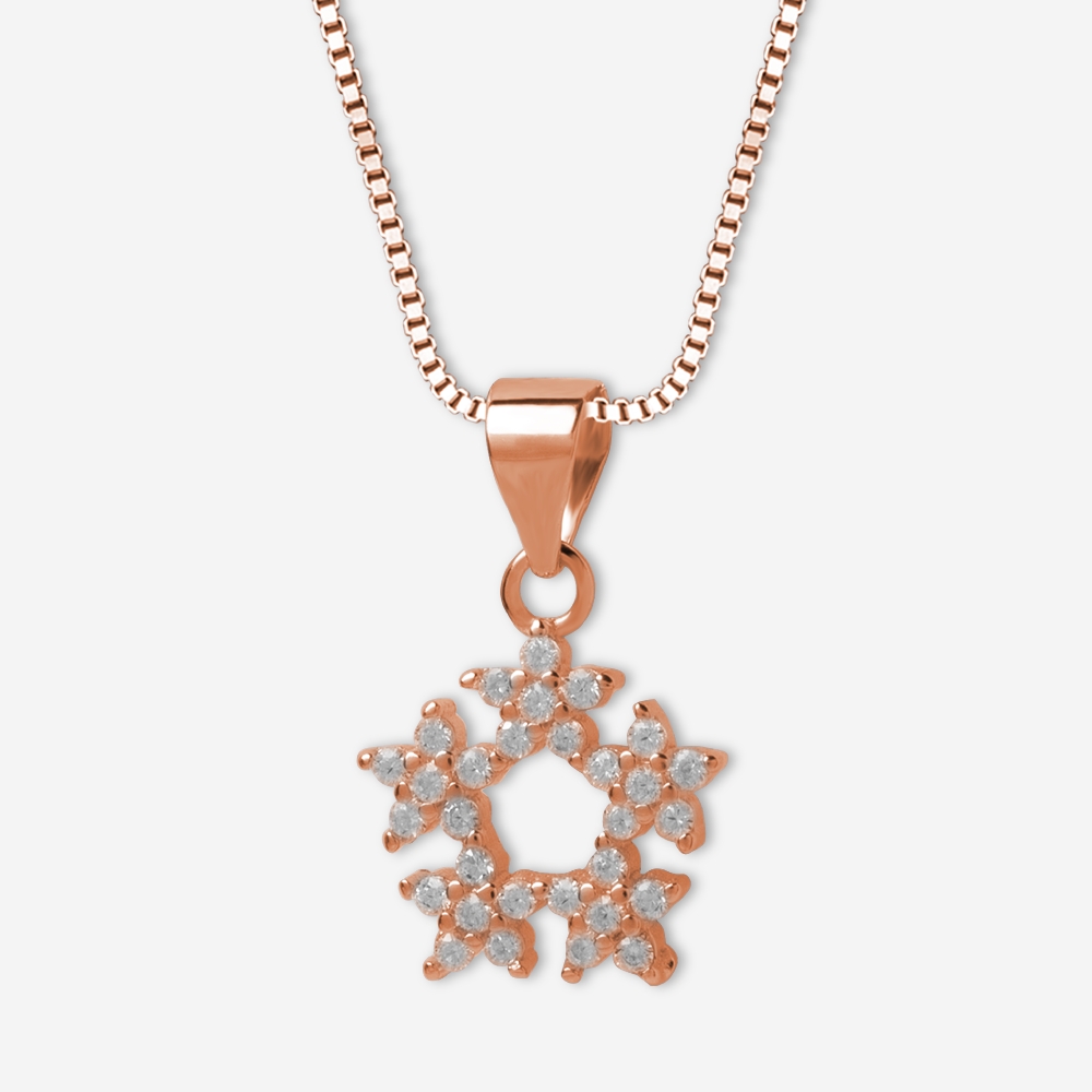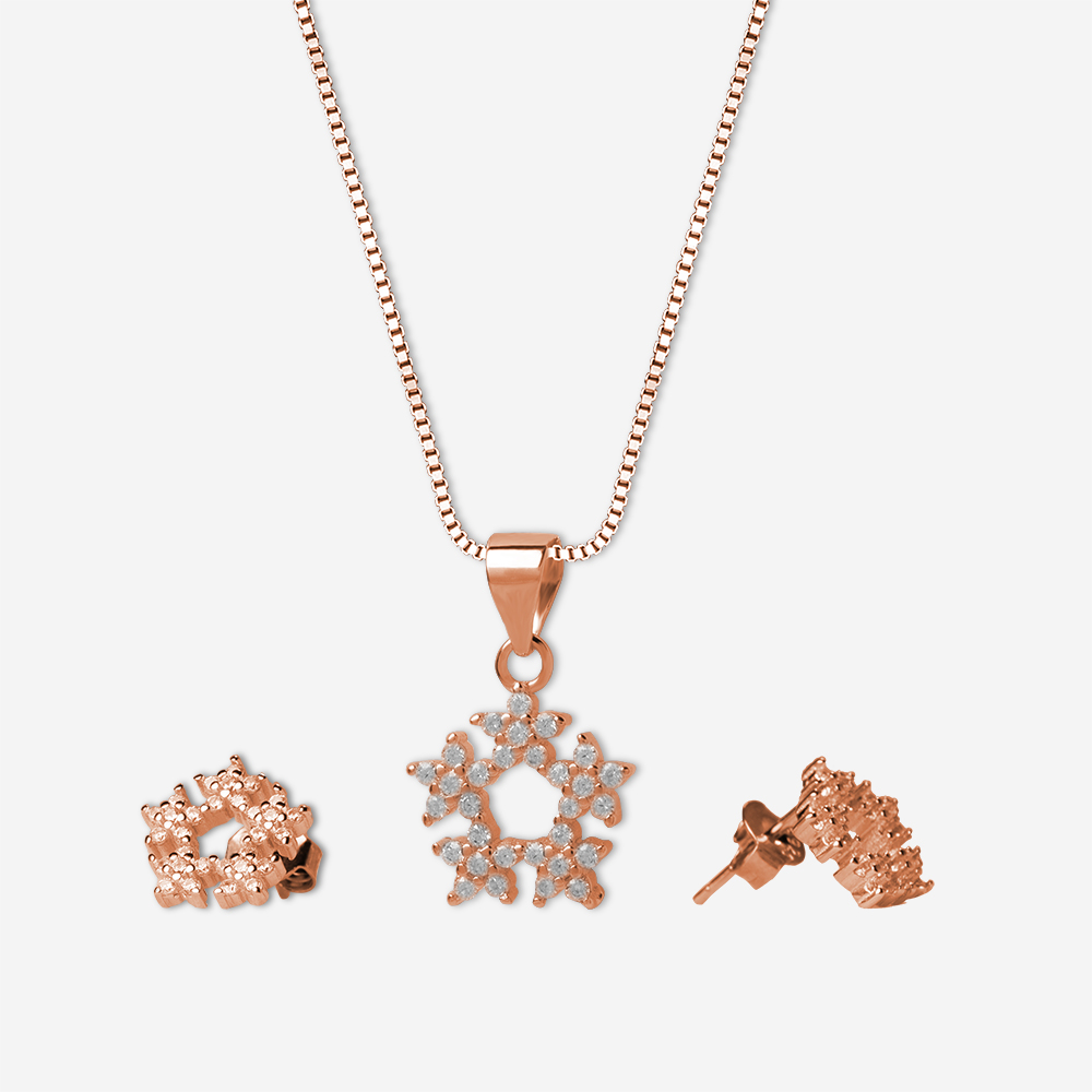 The Rose Wreath Sparkle Set from The Silver Soul (TSS) is beautifully crafted in premium 925 sterling silver, plated with a radiant rose gold finish for a touch of modern elegance. This set features a circular wreath-inspired design, symbolizing eternal beauty and femininity. The pendant and matching earrings are adorned with brilliant white cubic zirconia stones, each carefully micro-set to reflect light from every angle, creating a dazzling effect.