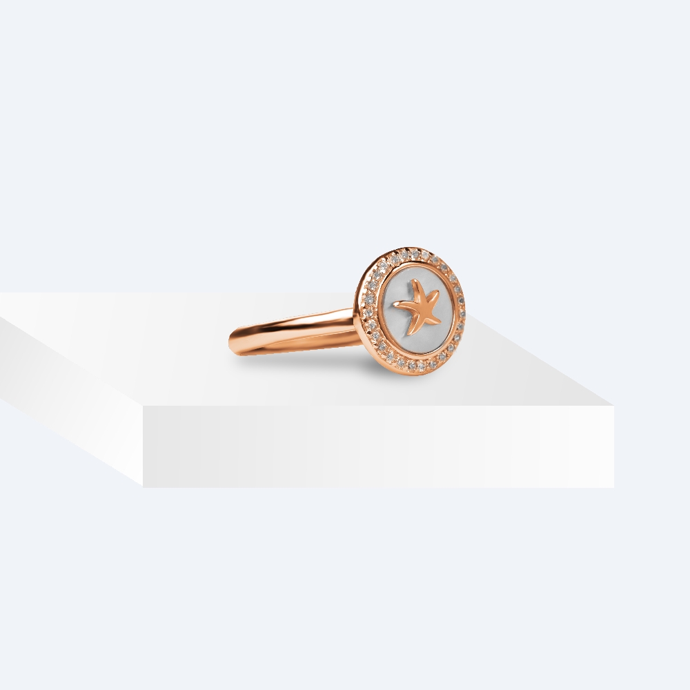 Capture a piece of the ocean’s charm with our Seastar Glint Enamel Ring, a delicate celebration of coastal elegance. This rose gold beauty features a finely detailed starfish motif resting on a mother-of-pearl enamel base, symbolizing renewal and strength. Surrounded by a halo of sparkling zirconia stones, this design merges modern luxe with seaside serenity. Perfect for beach lovers or those who carry the sea in their soul, this ring makes a subtle yet powerful statement of style and grace.