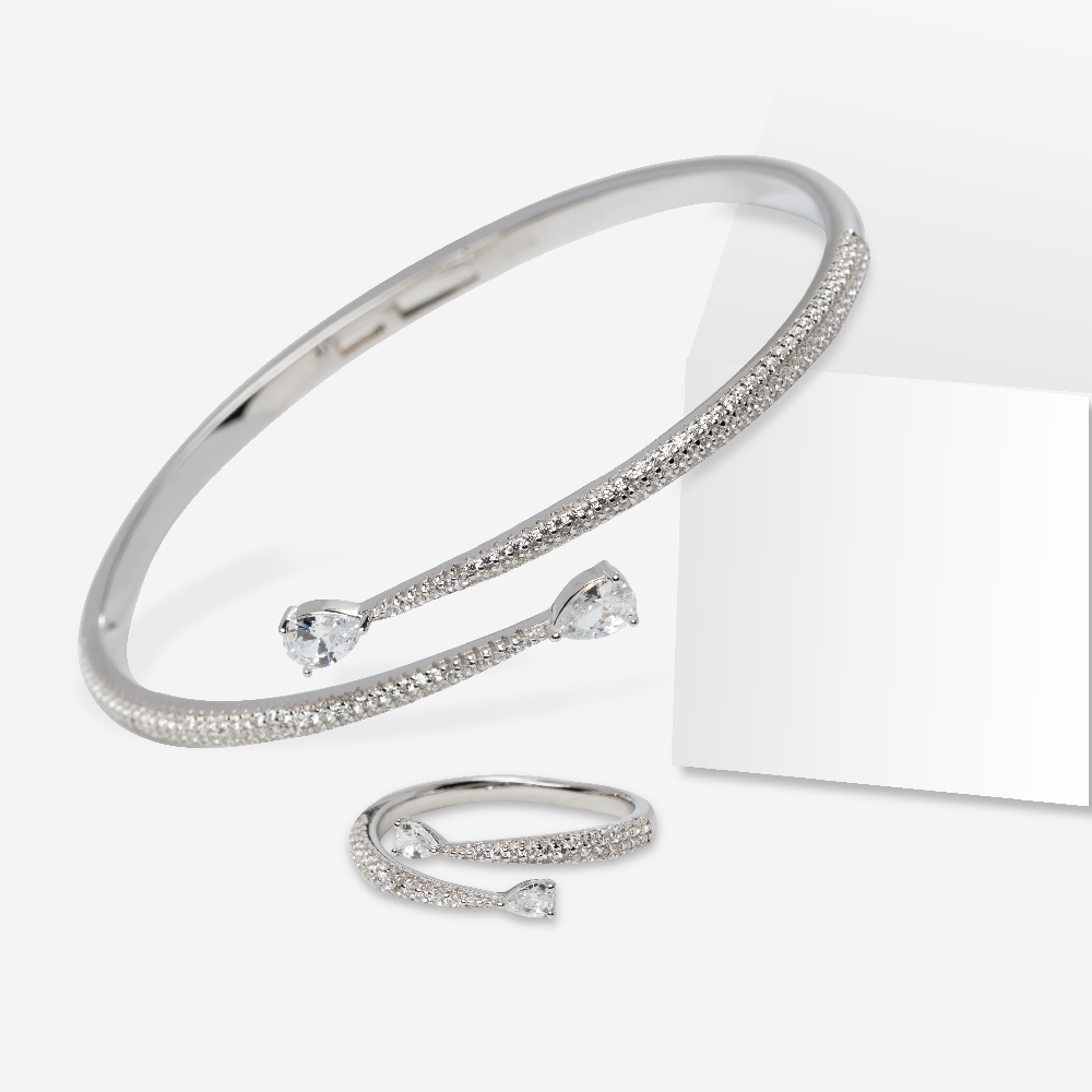 Gracefully crafted with teardrop CZ stones, this elegant bracelet and ring set adds a refined touch to any outfit. Designed in 925 silver with a radiant finish, it’s the perfect blend of everyday charm and occasion sparkle.