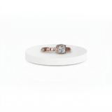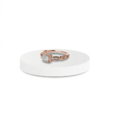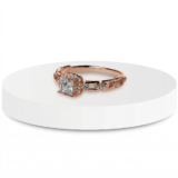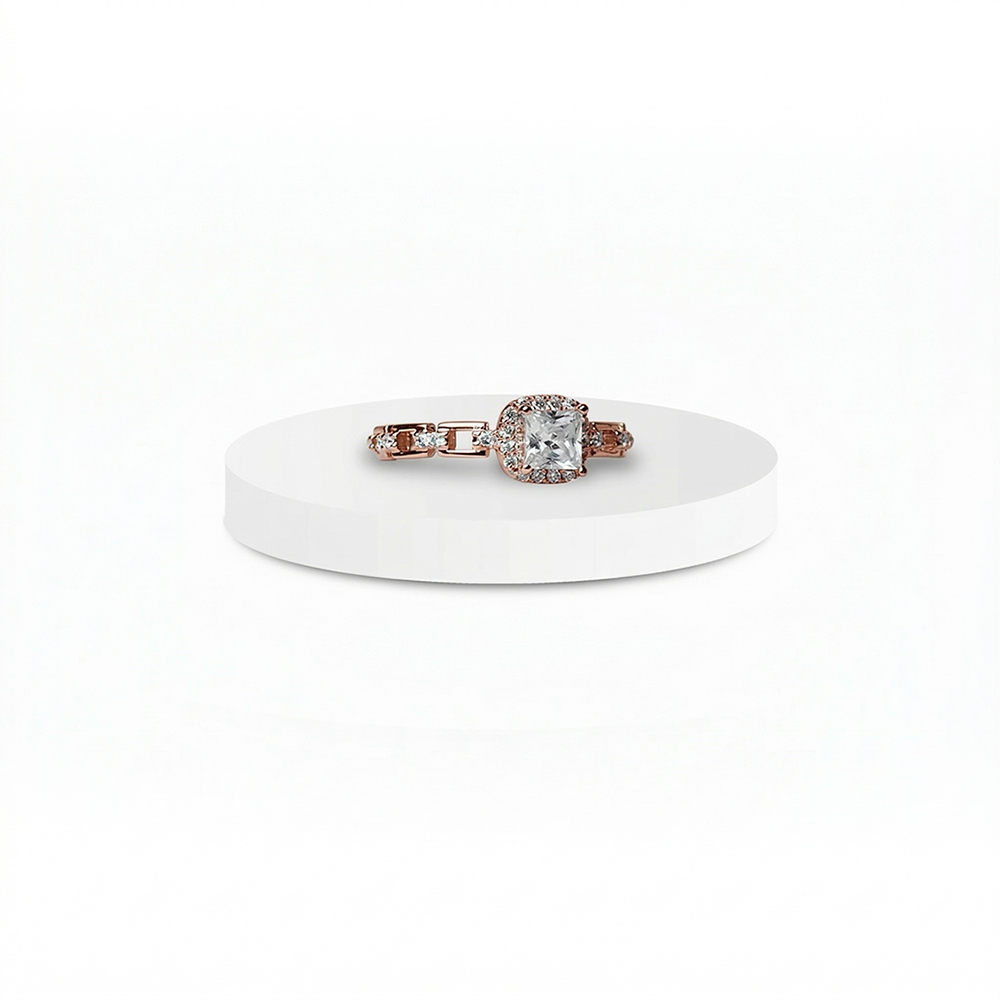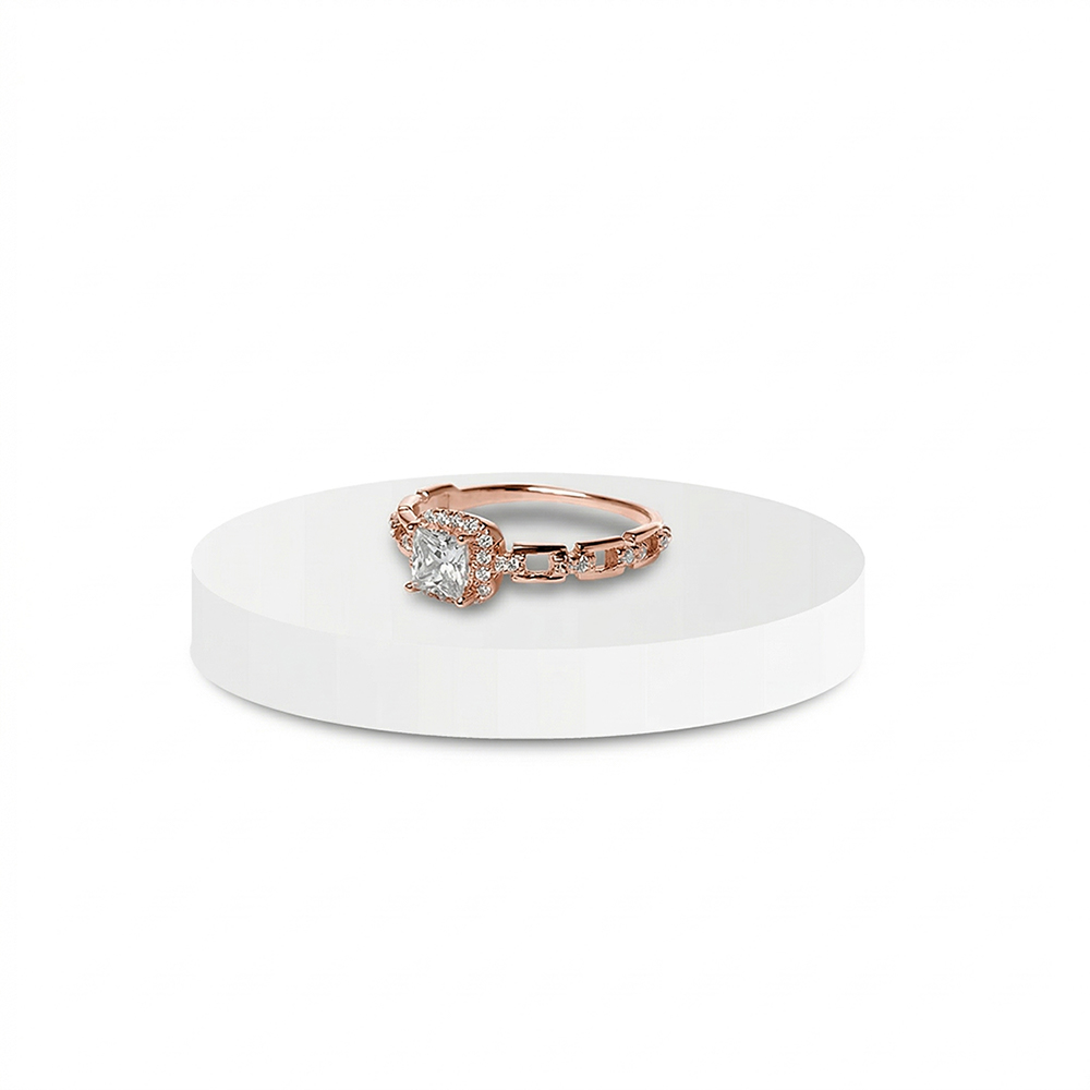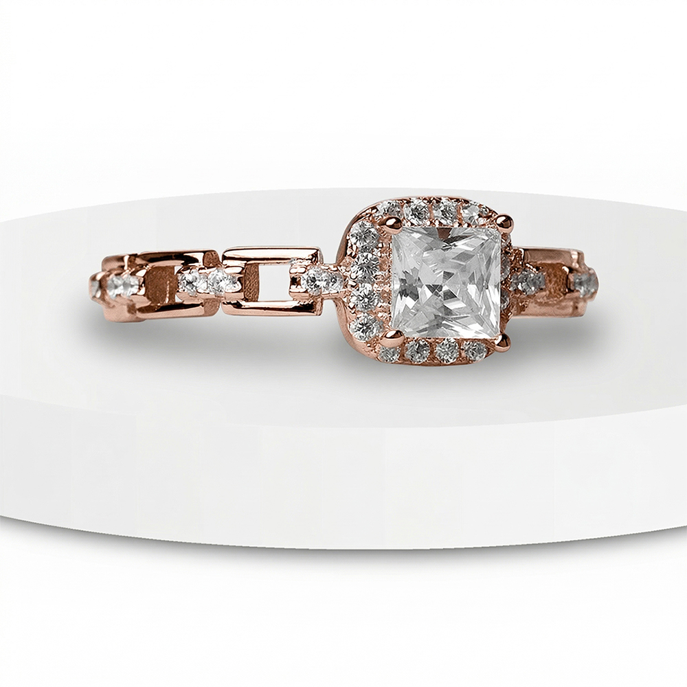 - The radiant rose gold princess-cut solitaire sits majestically at the center, exuding brilliance with every glance.